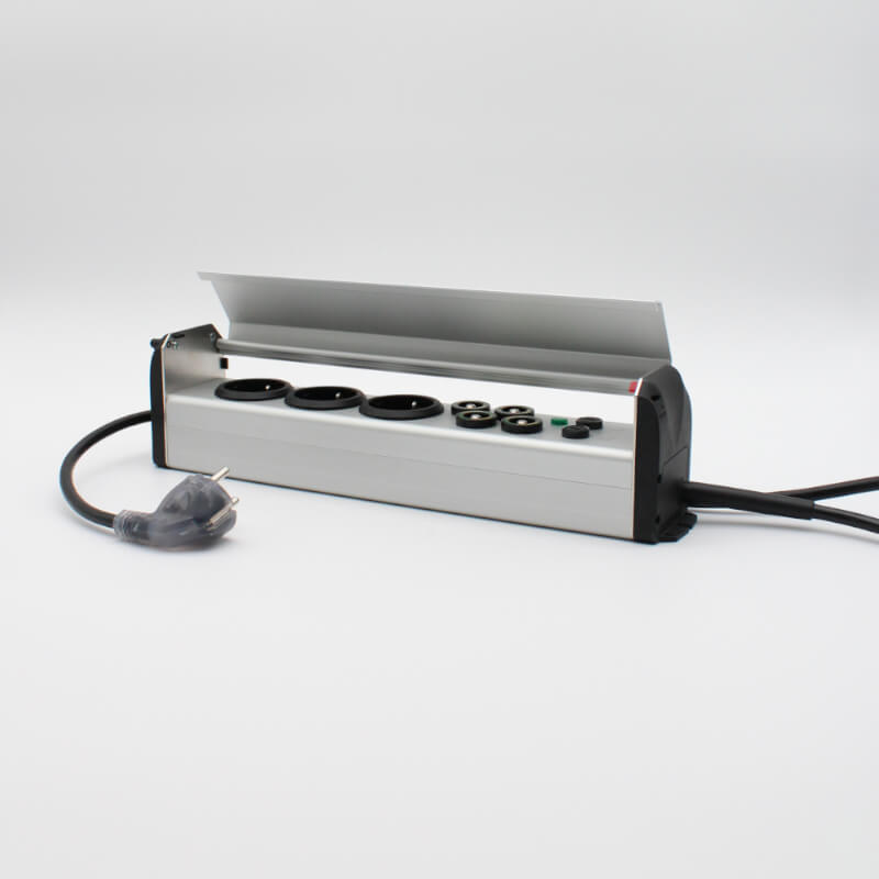 - 3 Sockets, Input Plug Type: Type E + F (CEE7/7), Output Sockets Type F (CEE 7/4) or optional Type E (CEE 7/5) - VDE certified sockets & 4 Potential Equalization Pins